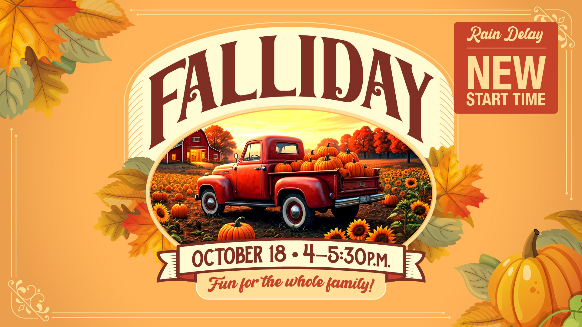 My Account Household Email Subscriptions Events Giving Groups Mission Trips Calls My Account My Events Event Calendar Registration Summary Registration History My Account My Giving Profile Give Online Text Giving Recurring Schedules History Tax Receipts My Account My Mission Trips Mission Trip Registration Event Details Falliday Lot Party Back to Calendar Celebrate the season with us at our Falliday Lot Party, a family-friendly festival full of fun for all ages. Kids will love the bounce houses, petting zoo, and trunk-or-treat, and the whole family can enjoy games, treats, and time together with our church community. Mark your calendars and invite your friends and neighbors. Falliday is the perfect way to kick off the fall season. Ministry Area: Family Ministry Activities When: Saturday, October 18, 20254:00 PM - 5:30 PM Add To Calendar Where: Stonebriar Community Church4801 Legendary DrFrisco, TX 75034 Map This Meeting Instructions: Feel free to come and go anytime you like between 3 and 5:30 p.m. on Saturday, October 18. When you’re headed to Stonebriar for Falliday, you can enter our campus via either Parkwood Boulevard or Legendary Drive. All the fun is outdoors on the northwest side of our property. We’ll have signs and parking attendants around to help you find your way! Contact: Gandia, Julie469-252-5377